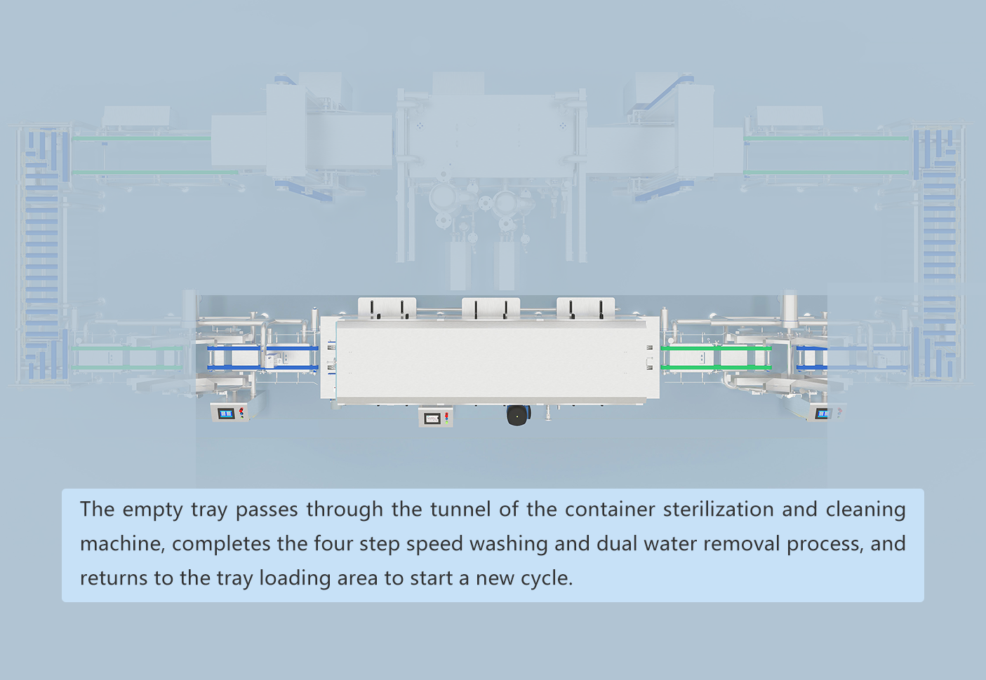 Für die schnelle Abkühlung von Backwaren. Integriert Sterilisations- und Reinigungsfunktionen für Behälter, ermöglicht kontinuierliches Abkühlen und Schalen-Rückführung in einem geschlossenen Kreisprozess.