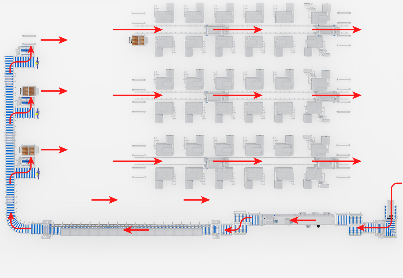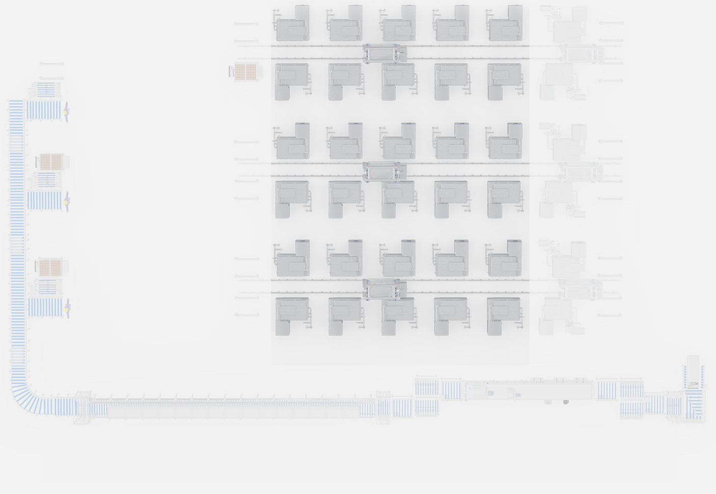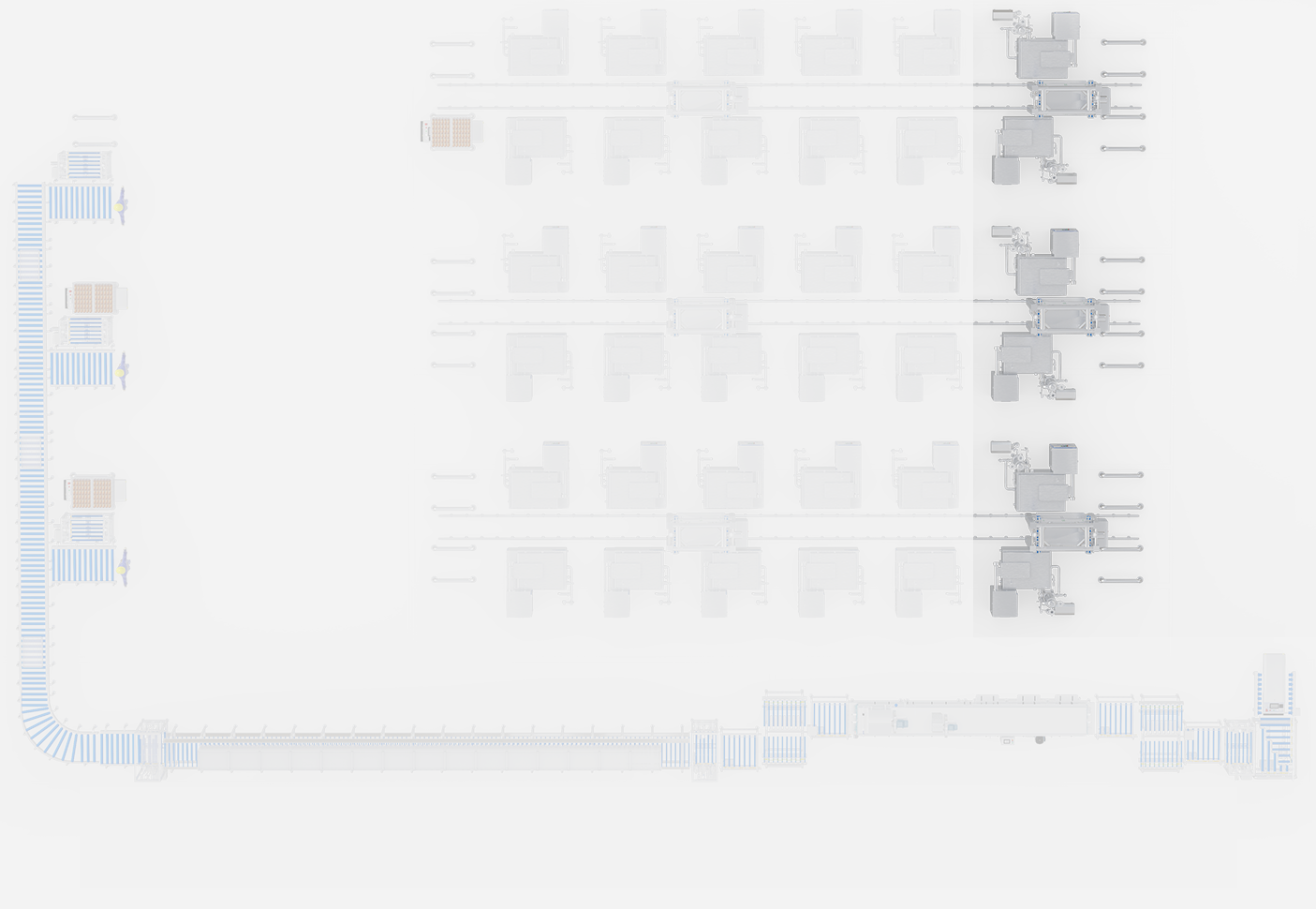 Für die Stapelproduktion von gewürztem Hühnerfleisch. Integriert Transport, Kochen, Kühlen und Reinigung von Containern in ein vollautomatisches System.