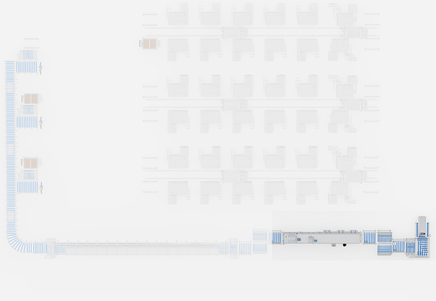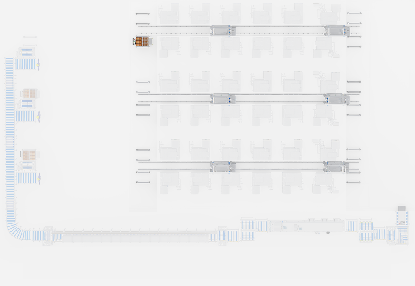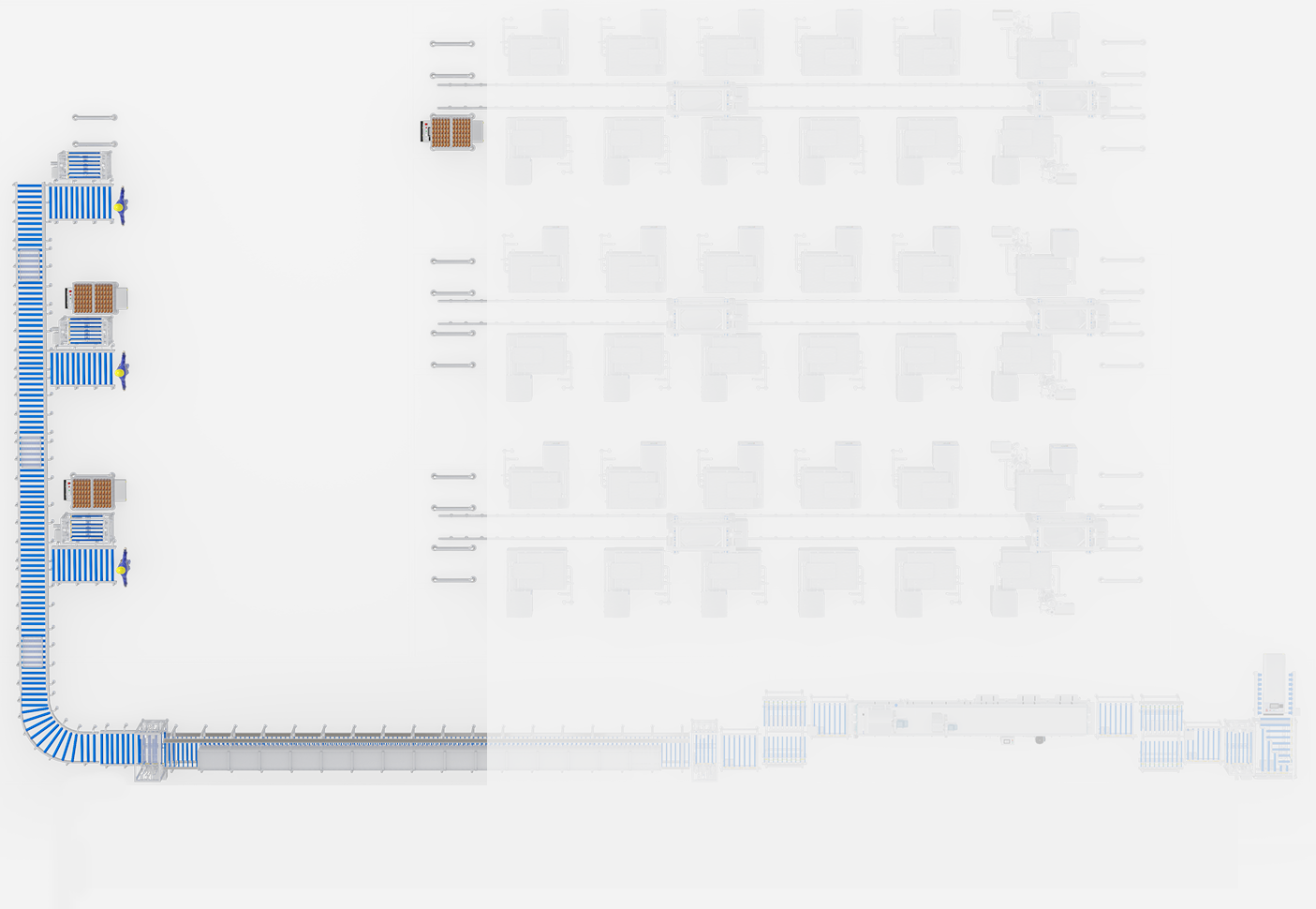 Für die Stapelproduktion von gewürztem Hühnerfleisch. Integriert Transport, Kochen, Kühlen und Reinigung von Containern in ein vollautomatisches System.